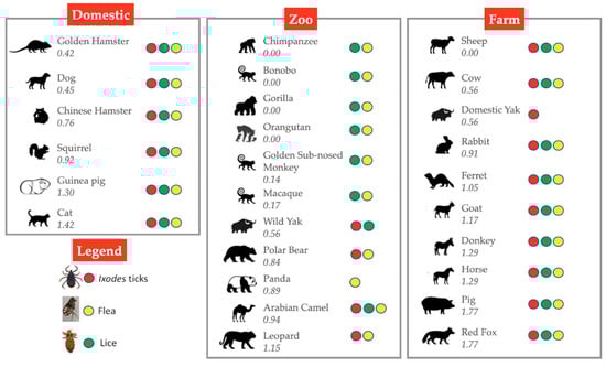 Animal hosts for ectoparasites. These animal hosts may be in contact with humans in domestic, agricultural or zoological settings. Numbers represent the predicted change in binding energy (ΔΔG) of the S-protein:ACE2 []. Supporting references [,,,].