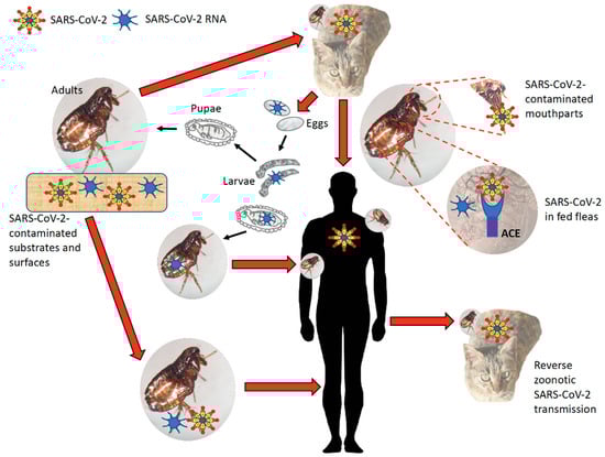 The hosts susceptible to severe acute respiratory syndrome coronavirus 2 (SARS-CoV-2) have a role in the coronavirus disease 19 pandemic (COVID-19) and are also infested by multiple blood-feeding arthropod ectoparasites [,,]. Natural infections with SARS-CoV-2 have been reported in several animal species with evidence of zoonotic (animal-to-human) and reverse zoonotic (human-to-animal) virus transmission []. Coronavirus-like organisms have been previously identified in tick Ixodes uriae [] and in unfed cat flea Ctenocephalides felis [], thus raising the question of the possible role of ectoparasite arthropod vectors on SARS-CoV-2 passive and/or biological transmission [].