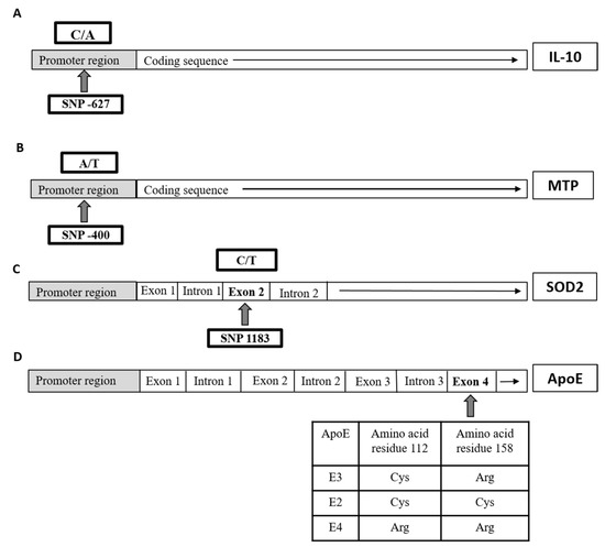 Schematic illustration of each single nucleotide polymorphisms (SNP) location on the gene level of (A) interleukin 10 (IL10), (B) microsomal triglyceride-transfer protein (MTP), (C) superoxide dismutase-2 (SOD2), and (D) apolipoprotein E (APOE) in the studied groups.