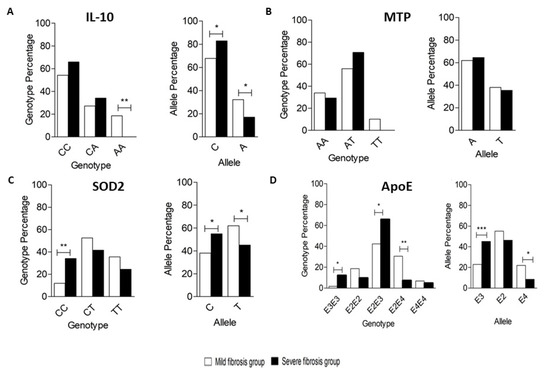 Genotyping and allele frequency of (A) IL10, (B) MTP, (C) SOD2, and (D) APOE in the studied groups. (A) Genotypes for the -627 IL10 polymorphisms in the Mild and Severe groups showing the frequency of distribution of each genotype in both groups by percentage (left panel); Alleles for the -627 IL10 polymorphisms in the Mild and Severe groups showing the frequency of distribution of each allele in both groups by percentage (right panel). (B) Genotypes for the -400 MTP (left panel); Alleles for the -400 MTP (right panel). (C) Genotypes for the 1183 SOD2 (left panel); Alleles for the 1183 SOD2 (right panel). (D) Genotypes for APOE (left panel), Alleles for APOE (right panel). * p < 0.05, ** p < 0.01, and *** p < 0.001.