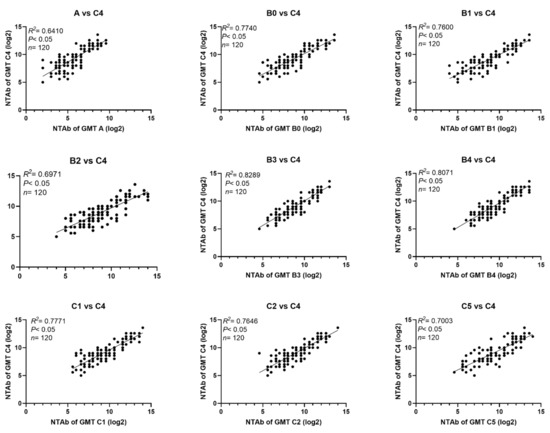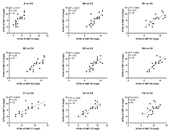 Correlation between NTAbs against different EV71 sub-genotypes and those against sub-genotype C4 in naturally infected infants and children.