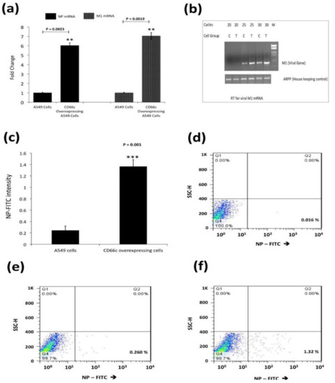 (a): Real time quantification of NP and M1 mRNA in viral infected A549 cells 8 h post infection (8 h.p.i) infected cells. Figure shows higher mRNA levels of NP (left two bars) and M1 (right two bars) in cells overexpressing CD66c. Each bar represents mean of five independent experimental readings. (b): Semi quantification of viral M1 by RT-PCR. For the above-mentioned reaction condition (8 h.p.i, and 1) viral M1 mRNA was also measured semi-quantitatively. Before each lane A549 control cells is denoted as ‘’C’’, or A549 cells having overexpressed CD66c with ‘‘T’’. Cycles are the number of PCR cycles. (c): Flow cytometric analysis for virus load in A549 infected cell: The bar diagram shows rise in viral NP in CD66c overexpressing A549 cells (right) than that in A549 cells (left). Each bar represents mean values of at least three independent experiments ± SD. Statistical significance was assessed by student’s t-test, (**) for p ≤ 0.01 and (***) for p ≤ 0.001. (d): Representative FACS snapshot of unstained A549 cells showing no signal corresponding to NP-FITC in lower-right quadrant; cells with some signal in (e); cells overexpressing CD66c with increased NP-FITC signal in lower-right quadrant (f).