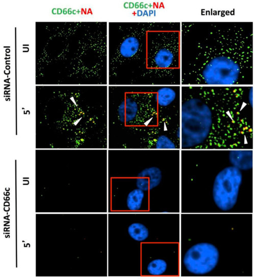 Knockdown of CD66c shows inhibition of virus binding on cell surface under fluorescent microscope. Here, UI denotes uninfected cells; 5′, Cells after 5 min of virus binding to them. Figure shows that A549 cells treated with siRNA control (negative) do not inhibit expression level of CD66c (green) and therefore binding of 5 multiplicity of infection (MOI) of PR8 viruses on cell surface can be seen. Figure shows colocalization between NA (red) and CD66c (green) in merged view (yellow) (second panel from top, pointed with white arrow). Amount of colocalization between NA and CD66c and absence of NA (red color) in control siRNA treated cells signifies possible colocalization between CD66c and NA at the host cell surface. The lowest two panels show diminished green signals in cells treated with CD66c siRNA suggesting a poor expression of CD66c protein (green). Consequently, virus binding on siRNA-CD66c treated cells is not seen, as evident by the absence of any green (CD66c) or red (NA) signal (bottom panel).