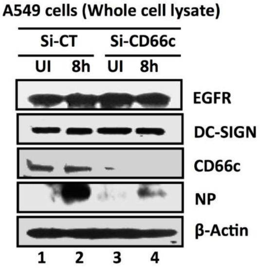 siRNA-mediated knockdown of CD66c shows inhibition of virus entry into lung-cells infected with 1 MOI of PR8 virus, through western blot analysis. Here, Si-CT denotes control siRNA treated cells; Si-CD66c are cells treated with CD66c siRNA. 8h are cells harvested after 8 h of infection (one life cycle of IAV), UI are uninfected cells. A549 cells treated with siRNA show complete knock down of the receptor molecule CD66c (third panel from top) while control siRNA treated cells do not show any reduction in expression of CD66c (left two wells of third panel). The fourth panel from top shows level of A/PR8/34 influenza virus entry in cells determined by expression levels of viral NP protein. The second well from left shows significant expression level of viral NP protein in cells treated with control siRNA, eight hours after infection. In contrast, the right-most well shows a marked reduction of influenza A virus (IAV) entry in cells treated with CD66c siRNA, as determined by low expression level of viral protein NP eight hours after infection. Conclusively, virus entry was inhibited in absence of CD66c (CD66c siRNA treated cells). CD66c siRNA treated cells do not show any noticeable change in expression levels of EGRF (topmost panel) and DC-SIGN (second panel from top). For loading control β-Actin was probed (the bottom panel).