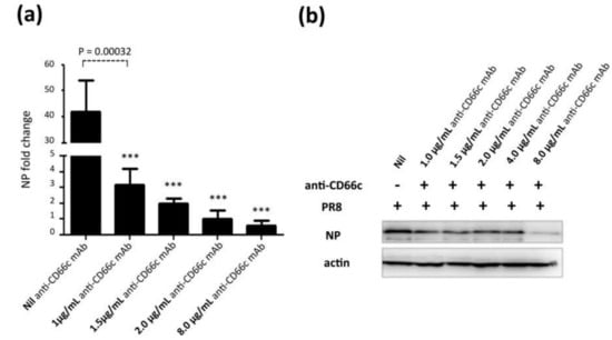 Antibody mediated receptor blockade experiments in CD66c overexpressing cells. (a): The figure shows level of A/PR8/34 influenza virus entry in a monolayer of NIH3T3-CD66c cells when treated with mAb anti-CD66c prior to infection. From left to right, the first bar in the figure represents levels of viral NP mRNA (a measure of virus entry) in untreated NIH3T3-CD66c. Bars second to fifth from left show levels of viral NP mRNA in virus-infected cells treated with mAb anti-CD66c at a concentration of 1.0 μg/mL, 1.5 μg/mL, 2.0 μg/mL and 8.0 μg/mL respectively. Conclusively, the data show a decrease in virus entry in cells treated with anti-CD66c in a dose dependent manner. Data represent mean values of at least three independent experiments ± SD. Statistical significance was assessed by student’s t-test (GraphPad), (*) for p ≤ 0.05, (**) for p ≤ 0.01 and (***) for p ≤ 0.001. (b): A western blot showing expression levels of viral NP protein in virus-infected NIH3T3-CD66c when treated with corresponding concentrations of mAb anti-CD66c 1.0 μg/mL, 1.5 μg/mL, 2.0 μg/mL, 4.0 μg/mL and 8.0 μg/mL, prior to viral infection. The inhibition of virus entry in anti-CD66c mAb treated cells was significant at a concentration of 8.0 μg/mL of CD66c.