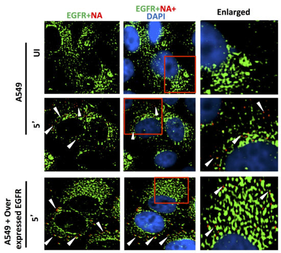 - Eierhoff, T.; Hrincius, E.R.; Rescher, U.; Ludwig, S.; Ehrhardt, C. The epidermal growth factor receptor (EGFR) promotes uptake of influenza A viruses (IAV) into host cells. PLoS Pathog. 2010, 6, e1001099. [Google Scholar] [CrossRef]