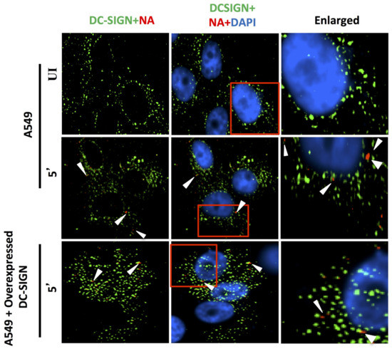 DC-SIGN (green) and influenza NA (red) after 5 min of virus binding. No trace of virus binding in uninfected cells (upper panel). Few co-localization spots (yellow spots, middle panel) in cells with endogenous level of DC-SIGN; in cells overexpressing DC-SIGN (green) there is no consequent increase in virus binding (bottom panel, white arrow) as compared to cells with endogenous level of DC-SIGN (middle panel, white arrow). Altogether, virus binding is not significantly increased with overexpression of DC-SIGN.