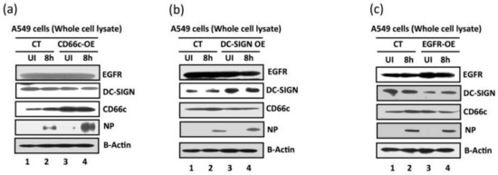 Comparative measurement of viral infection in cells overexpressing CD66c, EGFR and DC-SIGN respectively. CT, control A549 cells (untransfected) with endogenous levels of protein expression; CD66c-OE is A549 cells overexpressing CD66c; DC-SIGN-OE, A549 cells overexpressing DC-SIGN; EGFR-OE, A549 cells overexpressing EGFR; UI, uninfected cell groups; 8 h, cells harvested after 8 h of A/PR8/34 influenza virus infection. (a) The A549 cells overexpressing CD66c (CD66c-OE) demonstrate significantly increased virus entry as against A549 cells with endogenous levels of CD66c (CT) when determined by the expression levels of viral protein NP (fourth panel from top). Top two panels in figure also show that overexpression of CD66c has not affected expression levels of EGFR and DC-SIGN, and their expression levels remained same as in untransfected A549 cells (top two panels). β-Actin is loading control. (b): cells overexpressing DC-SIGN (DC-SIGN-OE) showed a slight increase in virus entry into cells as against A549 cells with endogenous levels of DC-SIGN (CT), when determined by the level of viral NP protein (fourth panel from top). More importantly, overexpression of DC-SIGN has not increased expression levels of EGFR and CD66c, whose levels remained same as in untransfected A549 cells (top and third panel from top). β-Actin is loading control here. (c): The expression levels of viral NP protein (fourth panel from top) suggests that overexpression of EGFR in A549 cells (EGRF-OE) does not result in further increase in virus entry. The virus entry in these cells is same as in A549 cells with endogenous levels of EGFR (CT). Accordingly, overexpression of EGFR does not increase expression levels of DC-SIGN and CD66c (second and third panel from top). β-Actin is loading control.