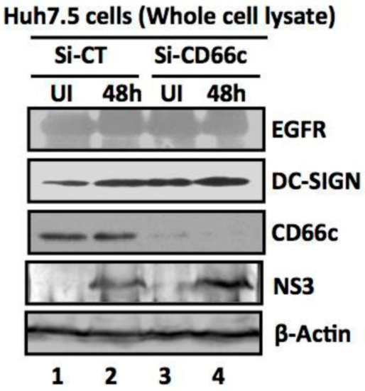 siRNA knockdown of CD66c in Huh7.5 cells have not inhibited entry of another non-IAV virus (Hepatitis C virus, HCV). Here, Si-CT denotes control siRNA treated human hepatoma cells; Si-CD66c are human hepatoma cells treated with CD66c siRNA. Cells are either left uninfected (UI) or infected with 0.5 MOI of HCV for 48 h (48 h). Human hepatoma cells harvested 48 h post infection are subjected to immunoblotting. The figure shows that CD66c siRNA treated human hepatoma Huh7.5 cells show reduced expression of CD66c (third panel from top). However, this siRNA-mediated knockdown of CD66c in Huh7.5 cells does not inhibit HCV entry as determined by the expression level of HCV viral protein NS3 (fourth panel from top). Huh7.5 cells knocked down for CD66c expression do not show any inhibitory effect in the expression levels of EGFR and DC-SIGN (upper two panels). β-Actin is loading control.