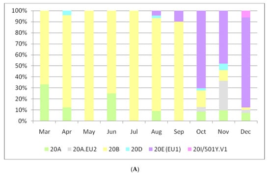Furthermore, phylogeny reported on Nextstrain (https://nextstrain.org/ncov/global, accessed 21 January 2021) showed that, in the global sampling, 20A and 20B (along with the 20C) were the most abundant clades, within the 11 known Nextstrain clades.
