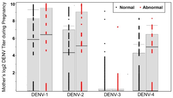 Effect of maternal DENV titer during pregnancy on adverse outcomes (N = 114). The rate of abnormal births in mothers with DENV-neutralizing antibodies was different than that of mothers lacking such antibodies.