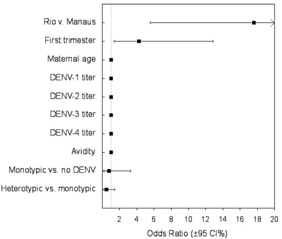 ZIKV infection was confirmed by RT-qPCR of blood and/or urine specimens [32]. Prior immunity to dengue was assessed via serological tests for anti-DENV IgG (with ELISA). In addition, to minimize the effect of potential cross-reactivity between DENV serotypes and ZIKV antibodies, maternal serotype-specific immunity to DENV was evaluated by plaque reduction neutralization tests (PRNT 80) following a standardized protocol, as discussed below.