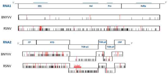 Polymorphisms along the RNA1 and RNA2 segments of RSNV and BNYVV. Black horizontal lines indicate untranslated regions, rectangular boxes indicate ORFs and blue horizontal lines indicate conserved functional domains. Black and red vertical bars indicate positions of parsimony informative polymorphisms (synonymous and non-synonymous polymorphisms, respectively), based on DNAsp analyses independently for each viral species [47]. Red horizontal line indicates the insertion in RNSV TGBp1. Mtr, methyltransferase, Hel, helicase, Pro, protease, RdRp, RNA-dependent RNA polymerase, CP, coat protein, RTD, read-through domain, TGBp, triple gene block protein, CRP, cystein-rich protein.