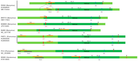 Organization of benyvirus and hordei-like TGBp1. Nucleolar localization signal (NoLS) and nuclear localization signals (NLS) were detected using Nucleolar localization sequence detector (NOD) [44] and cNLS mapper, for prediction of NLS specific to the importin αβ pathway [45]. Helicase domain and its conserved motifs I-VI were indicated in dark green based on [46]. The RSNV insertion domain is indicated by black lines. RSNV, rice stripe necrosis virus isolates col and M1-1, BNYVV, beet necrotic yellow vein virus, BSBMV, beet soil-borne mosaic virus, BdMV, burdock mottle virus, PMTV, potato mop-top virus, PCV, peanut clump virus, BSMV, barley stripe mosaic virus.