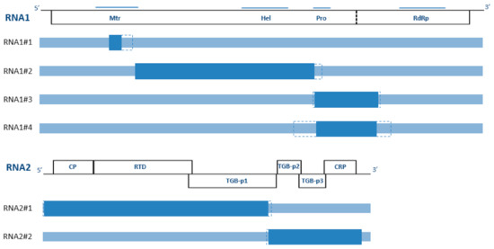 Benyviruses have non-enveloped multipartite rod-shaped particles. They are transmitted by soil-borne plasmodiophorid protists of the genus Polymyxa. Benyviruses can persist in the soil for decades through the vector spores [17]. Benyviruses have positive single-stranded RNA genomes composed of two to five segments, depending on the viral species [12]. The housekeeping genes are encoded by the two largest segments of ca. 6600 and 4600 nucleotides, respectively. RNA1 contains a single large open reading frame (ORF) that encodes the replication polyprotein including methyltransferase (Mtr), helicase (Hel), protease (Pro) and the RNA dependent RNA polymerase (RdRp) domains [12]. RNA2 contains six ORFs (ORF2-ORF7). ORF2 encodes the major coat protein (CP). ORF3 is translated from a readthrough (RT) mechanism producing a fusion of the CP and RT domain embedded in the viral capsid and participates in the vector transmission [12]. ORF4-6 form the Triple Gene Block (TGB) involved in virus movement. TGBp1 binds to RNA and interacts with TGBp2 and TGBp3 [18]. ORF7 encodes the cysteine-rich protein (CRP) dedicated to the viral suppressor of RNA silencing (VSR) [19]. BNYVV and BSBMV clones have been constructed using RNA1 and RNA2 segments and have the ability to infect Nicotiana benthamiana and Beta macrocarpa [20,21]. However, in nature, BNYVV, BSBMV and BdMV have additional small genomic components (RNA3 and RNA4). RNA3 contains two ORFs that encode a p25 protein responsible for the modulation of symptoms in leaves and roots, and a 6.8 kDa protein expressed only from RNA3 truncated forms [22,23]. RNA4 encodes a p31 protein, described as a root specific VSR [20], and is involved in vector transmission [20,24]. RNA5 is only present within some BNYVV isolates, and encodes a p26 protein, which induces severe rhizomania symptoms and highly-reduced sugar yields [25]. It has been suggested that RNA5 originates from a duplication of RNA3 [26].