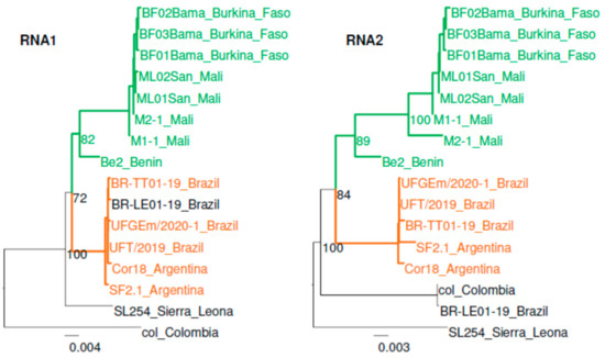 Phylogenetic analyses were performed without the recombinant domains (Figure 4). Two main lineages were detected, both with RNA1 and RNA2: one African lineage with isolates from Mali and Burkina Faso, and one South American lineage with isolates from Argentina and Brazil. This result contrasted with BNYVV for which no geographical structure has been detected between the previously reported types A and B [27] based on the phylogenetic trees with RNA1 and RNA2 (data not shown). The RSNV Colombian isolate, used as a reference until now, and the isolate SL254, showed a high divergence compared to the other isolates, suggesting the existence of other lineages. As described for BNYVV RNA3, 4 and 5 segments [28], we detected a putative reassortment event between RSNV RNA1 and RNA2. Indeed, RNA1 of the Brazilian isolate BR-LE01-19 belonged to the South American lineage, whereas its RNA2 was closer to the Colombian one. In addition, we noticed that although the RNA2 sequences of the Brazilian isolates BR-TT01-19 and UFT/2019 contained the same deletion in TGBp1, such as isolates BR-LE01-19 and col, they still clustered in the South American lineage.