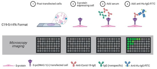 Schematic of the C19-S-I-IFA assay. Serum samples were added to A549-SARS-CoV-2-spike expressing cells. Bound anti-COVID-19-IgG were detected with anti-human-IgG-FITC. Positive cells were indicative of virus-infected sera.