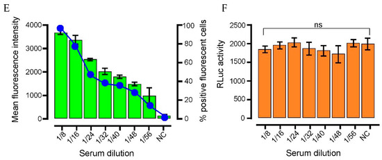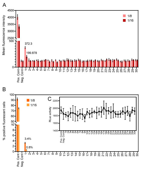 Levels of anti-SARS-CoV-2 IgG antibodies detected through the C19-S-I-IFA assay in the sera from thirty volunteer donors. (A) Bar heights represent mean fluorescence intensities for each dilution. (B) Percentage of fluorescent positive cells. (C) RLuc was used as an internal transfection control. Bar heights represent the mean of two biological replicates: error bars show SEMs.