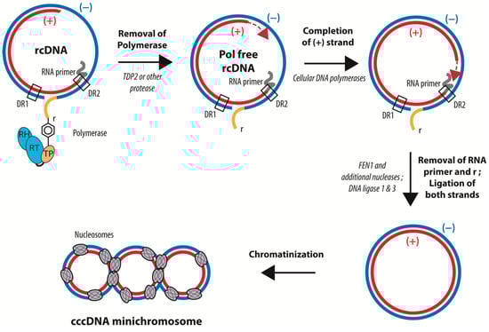 - Wei, L.; Ploss, A. Hepatitis B virus cccDNA is formed through distinct repair processes of each strand. Nat. Commun. 2021, 12, 1591. [Google Scholar] [CrossRef]