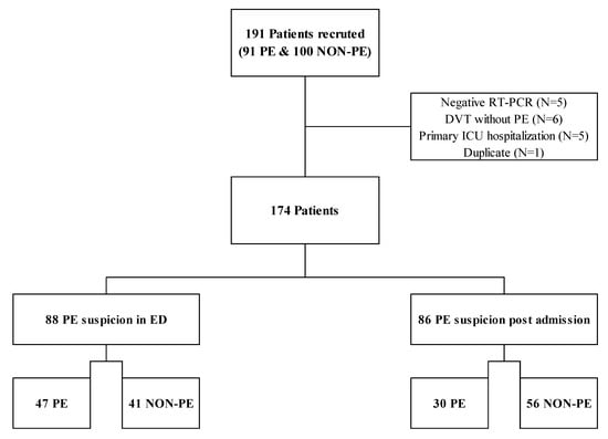 Considered for study were all consecutive adults (≥18 years old) with confirmed COVID-19 infection (positive RT-PCR) hospitalized in a participating Internal Medicine and Pneumology ward and for whom an in-hospital CT pulmonary angiography (CTPA) was performed for clinical suspicion of PE based on the presence of chest pain, tachycardia, electrocardiogram abnormality, dyspnea, worsening of SpO2 or an increase of oxygen requirements, lower limb pain, D-dimer levels (upon admission or its evolution), and the absence of respiratory improvement. Patients diagnosed with an isolated deep venous thrombosis (DVT) were excluded, as were patients directly admitted to the ICU without initial hospitalization in general ward (ICU patients). The whole population was divided into two subsets depending on whether the CTPA was made in the ED or during hospitalization in a medicine ward to avoid confounding bias related to thromboprophylaxis and its consequences on laboratory markers. This study analyzed COVID-19 patients with a confirmed PE (PE subset) or not (NON-PE subset) based on CTPA performed during the medicine ward stay (at least 24 h after transfer from ED, Figure 1).