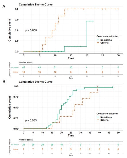 Cumulative events curve of ICU transfer or death in panel (A) and time to hospitalization discharge in panel (B), depending on the presence of double criteria D-dimers ≥ 2000 ng/mL and neutrophils count ≥ 7 G/L (composite outcome). The p represents the global p-value of Log-rank test in the Cox model. The risk table represents the patients still at risk of the event.