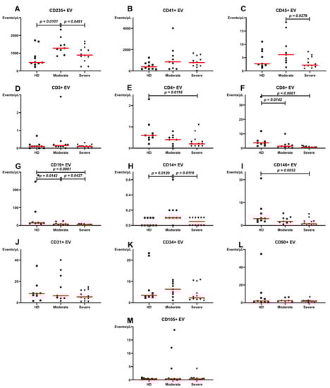 Concentration of plasma extracellular vesicles (EVs) in healthy donors, patients with moderate or severe COVID-19 at the beginning of in-patient department treatment, events/µL. (A). CD235a+ EV. (B). CD41+ EV. (C). CD45+ EV. (D). CD3+ EV. (E). CD4+ EV. (F). CD8+ EV. (G). CD19+ EV. (H). CD14+ EV. (I). CD146+ EV. (J). CD31+ EV. (K). CD34+ EV. (L). CD90+ EV. (M). CD105+ EV. Red lines represent median values.