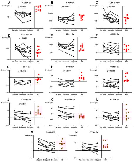 The three-point dynamic assessment demonstrated significant progressive loss of CD63+ and CD147+ plasma EVs (Figure 2). Noteworthy, plasma levels of CD63+ EVs were lower at each treatment time-point in patients than in HD (p = 0.001).