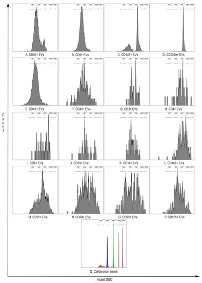 Representative results of side scatter intensity distribution detected from 405 nm violet laser characterizing EVs heterogeneity compared with polystyrene beads with known diameters. (A). CD9+ EV. (B). CD9+ EV. (C). CD147+ EV. (D). CD235a+ EV. (E). CD41+ EV. (F). CD45+ EV. (G). CD3+ EV. (H). CD4+ EV. (I). CD8+ EV. (J). CD19+ EV. (K). CD14+ EV. (L). CD146+ EV. (M). CD31+ EV. (N). CD34+ EV. (O). CD90+ EV. (P). CD105+ EV. (Q). Sub-micron Particle Size Reference Kit Beads 100, 190, 490, 1000, and 1900 nm diameter.