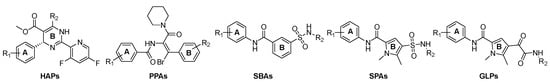 The HBV capsid is composed of 120 core protein (Cp) dimers that primarily assemble to form capsids with T = 4 icosahedral symmetry (~95%), with a small number of T = 3 capsids having been observed in HBV-infected human liver samples and in vitro-assembled capsids from recombinant HBV Cp [,,,]. HBV genome synthesis from pgRNA via reverse transcription is highly dependent on properly assembled viral capsids []. In addition, Cp is also implicated in transporting the HBV genome to the nucleus and epigenetic regulation of HBV gene expression [,]. Therefore, Cp represents an attractive target in anti-HBV drug discovery [,]. Small molecules can destabilize the HBV core protein, increase the capsid assembly rate, and form either aberrant or empty, nonfunctional capsid particles []. In recent years, a few major chemical classes have been reported as novel capsid assembly modulators (CpAMs) (Figure 1): heteroaryldihydropyrimidines (HAPs), phenylpropenamides (PPAs), sulfamoylbenzamides (SBAs), sulfamoylpyrroloamides (SPAs), and glyoxamoylpyrroloxamides (GLPs) [,]. Among them, HPAs, PPAs, and SBAs are the most studied [].