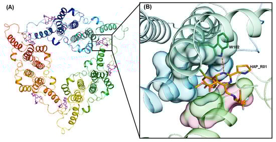 (A) Binding sites of HAP_R01 in a Cp “trimer of dimers” complex. HAP_R01 molecules are shown as purple sticks; (B) HAP_R01 binding pocket at B–C interface. Chain B and Chain C of the Cp Y132A structure are colored in light blue and light green, respectively. The key H-bond interaction between W102 and the dihydropyrimidine N-3 of HAP_R01 is depicted as a red dashed line. The deep halogen binding pocket created from the B chain part of the pocket (concave, blue) and the C chain part of the pocket (cap, green and pink) are shown in surface representation. The figure was created based on PDB ID: 5WRE [].