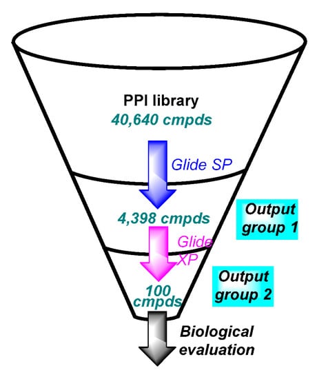 The Schrödinger Maestro Ligand Docking function (Glide) was employed for virtual screening using the prepared receptor grid and prepared ligands [,,]. The Van der Waals radii of nonpolar atoms for each of the ligands were scaled by a factor of 0.8. For the first round, Glide SP (standard precision) was selected to rapidly narrow down the search to a smaller number of ligands with a reasonable docking score. During the docking process, flexible ligand sampling was selected. Options to add Epik state penalties to docking score, to reward intramolecular H bonds, and to enhance planarity of conjugated pi groups were selected during the calculation. The output of this calculation resulted in 4398 structures with a docking score >8.0 (Output group1). This group was resubjected to Glide XP docking to obtain more precise results using the Maestro Ligand Docking function (vide supra), the only difference being the use of XP (extra precision) during the calculation to improve the accuracy. Based on both docking scores and preferred binding modes, a final collection of 100 compounds from the commercial PPI-40 library were selected for biological evaluation.