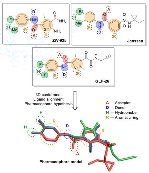 Pharmacophore model generated using ZW-935, Janssen, and GLP-26 as active ligands. Acceptor, donor, hydrophobe, and aromatic ring features are denoted by A, D, H, and R, respectively. Ligand alignment between ZW-935, Janssen, and GLP-26 are shown in green, red, and blue sticks, respectively (bottom).
