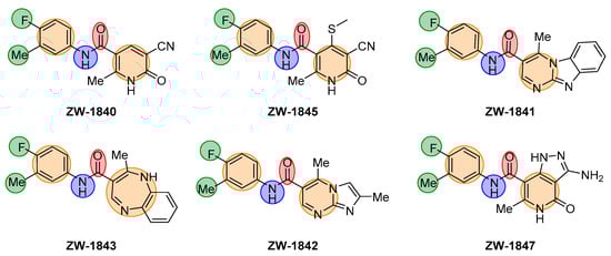 Significantly, a few common structural features among these active ligands allowed us to formulate a tentative pharmacophore model based on their ligand alignments (Figure 4) using the molecular modeling program “Phase” (Schrödinger Inc., New York, NY, USA) [,]. These features are denoted as A (acceptor), D (donor), H (hydrophobe) and R (aromatic ring). At this point, instead of conducting the typical virtual screening against a compound library, we chose to pursue a pharmacophore-guided design and synthesis of a small library with numerous complex heterocyclic cores conforming to the common pharmacophore features. Similar approaches have been used by others in medicinal chemistry [,,,,,,]. Designed compounds are shown in Figure 5. The synthetic tractability from a common intermediate was considered during the process for rapid access to final compounds. Preserved pharmacophore features are shown in the same color as used in the pharmacophore model (Figure 5 vs. Figure 4). The proposed analogs were subjected to molecular docking (PDB ID: 5WRE) using Schrödinger Maestro 2019-1. Compounds were assessed based on both the docking score and the desired binding modes with key residues such as W102 and halogen binding pocket residues. Selected compounds were synthesized and evaluated in our assays.