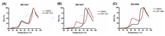 TSA profiles of selected hit compounds that bind to HBV Cp and affect capsid formation and stability. HBV Cp melting curves in the presence of 1% DMSO are shown in red; HBV Cp melting curves in the presence of 20 µM compound (ZW-1841 (A), ZW-1847 (B), and ZW-1888 (C)) and 1% DMSO are shown in black.