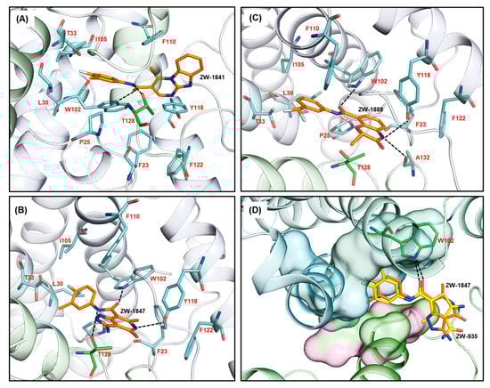 Predicted optimal binding modes of (A) ZW-1841, (B) ZW-1847, and (C) ZW-1888, and (D) the overlay of the best binding poses of ZW-935 and ZW-1847. Potent compounds identified in this study are shown in orange carbon skeleton and ZW-935 is shown in yellow carbon skeleton. The active site residues are shown as light blue and light green sticks. Important interactions are depicted as black dashed lines. Intramolecular H-bonding is shown as a red dotted line. Valency and hydrogen atoms are omitted for clarity. Molecular modeling was carried out using PDB ID: 5WRE.