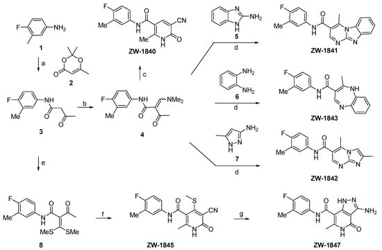 During the synthetic planning, we recognized compounds 3 and 4 (Scheme 1) as versatile intermediates with a potential to be rapidly converted into numerous complex heterocyclic cores. The intermediate 3 was conveniently accessed via an aqueous phase reaction between 4-fluoro-3-methylaniline (1) and 2,2,6-trimethyl-4H-1,3-dioxin-4-one (2) []. Base-mediated addition of 2-cyanoacetamide to the intermediate 4 followed by a thermal cyclization yielded the 6-methyl pyridine derivative ZW-1840 []. The intermediate 4 was further diversified to rapidly generate fused heteroaromatic cores by reacting it with the corresponding amines (5, 6 and 7) under thermal conditions [] to yield ZW-1841, ZW-1842, and ZW-1843. Pyrazolopyridone chemotype ZW-1847 was obtained via a three-step process starting from the intermediate 3 []. First, compound 3 was added to CS2 in base-mediated fashion followed by a methylation to yield oxoketene dithioacetal intermediate 8. The cyclocondensation reaction of 2-(bis(methylthio)methylene)-3-oxo-N-arylbutanamide (8) with cyanoacetamide using NaOiPr as base under reflux condition afforded functionalized pyridone (ZW-1845). Further, [3 + 2] cyclocondensation reaction of the pyridone with hydrazine in the presence of alcohol yielded the final pyrazolopyridones compound ZW-1847.