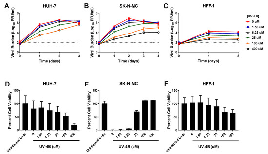 Antiviral activity of UV-4B against dengue virus (DENV) in HUH-7, SK-N-MC, and HFF-1 cells (A–C). HUH-7 (A) cells were infected at a multiplicity of infection (MOI) of 0.01, and SK-N-MC (B) and HFF-1 (C) cells were infected at an MOI of 0.1. Infected cells were treated with different concentrations of UV-4B. Viral burden was quantified via plaque assay on Vero cells, and reported as log10 plaque forming units per mL (PFU/mL). Data points represent the mean of three independent samples, and error bars correspond to one standard deviation. The dashed line signifies the assay limit of detection. (D–F) Effect of UV-4B treatment on cell viability of DENV-infected HUH-7 (D), SK-N-MC (E), and HFF-1 (F) cells. HUH-7, SK-N-MC, and HFF-1 cells were infected with DENV at MOIs of 0.01, 0.1, and 1, respectively, then treated with different concentrations of UV-4B. Cell viability was measured after three days with the commercially available WST-1 assay according to manufacturer specifications. Cell viability is reported as percent cell viability relative to an untreated, uninfected control. Columns represent the mean of 6 independent samples, error bars represent one standard deviation.