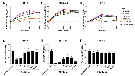 Cytotoxicity studies in uninfected cells demonstrated that IFN caused no cytotoxic effect in HUH-7 and HFF-1 cells at evaluated concentrations (CC50s > 10,000 IU/mL) (Table 1, Supplementary Figure S1). IFN concentrations ranging from 1–1000 IU/mL were similarly nontoxic to SK-N-MC cells, but cytotoxicity was detected at drug concentrations greater than 1000 IU/mL, yielding a CC50 value of 1074 IU/mL (Table 1, Supplementary Figure S1). Assays conducted in infected cells showed IFN protects HUH-7 and SK-N-MC cells from cell damage and death associated with infection. This protective effect was most pronounced in HUH-7 cells, where treatment with IFN at concentrations ≥ 10 IU/mL markedly increased cell viability relative to untreated, infected cells (Figure 2D). Exposure to nontoxic concentrations of IFN also increased viability of infected SK-N-MC cells in a concentration dependent manner (Figure 2E), but this cell line was not as sensitive to IFN effect so improvements in percent cell viability were less than those observed in HUH-7 cells. Cell viability of infected HFF-1 cells was not appreciably different from the uninfected control because infection does not cause CPE or cell death in this cell line (Figure 2F). Percent cell viability stayed constant following addition of increasing IFN concentrations, further illustrating this drug’s lack of cytotoxic effects at evaluated concentrations.