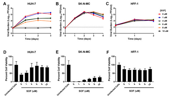 Antiviral activity of sofosbuvir (SOF) against dengue virus (DENV) in HUH-7, SK-N-MC, and HFF-1 cells (A–C). HUH-7 (A) cells were infected at a multiplicity of infection (MOI) of 0.01, and SK-N-MC (B) and HFF-1 (C) cells were infected at an MOI of 0.1. Infected cells were treated with different concentrations of SOF. Viral burden was quantified via plaque assay on Vero cells, and reported as log10 plaque forming units per mL (PFU/mL). Data points represent the mean of three independent samples, and error bars correspond to one standard deviation. The dashed line signifies the assay limit of detection. (D–F) Effect of SOF treatment on cell viability of DENV-infected HUH-7 (D), SK-N-MC (E), and HFF-1 (F) cells. HUH-7, SK-N-MC, and HFF-1 cells were infected with DENV at MOIs of 0.01, 0.1, and 1, respectively, then treated with different concentrations of SOF. Cell viability was measured after three days with the commercially available WST-1 assay according to manufacturer specifications. Cell viability is reported as percent cell viability relative to an untreated, uninfected control. Columns represent the mean of 6 independent samples, error bars represent one standard deviation.