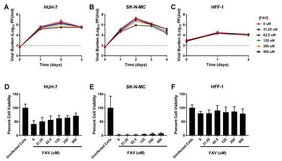 Antiviral activity of favipiravir (FAV) against dengue virus (DENV) in HUH-7, SK-N-MC, and HFF-1 cells (A–C). HUH-7 (A) cells were infected at a multiplicity of infection (MOI) of 0.01, and SK-N-MC (B) and HFF-1 (C) cells were infected at an MOI of 0.1. Infected cells were treated with different concentrations of FAV. Viral burden was quantified via plaque assay on Vero cells, and reported as log10 plaque forming units per mL (PFU/mL). Data points represent the mean of three independent samples, and error bars correspond to one standard deviation. The dashed line signifies the assay limit of detection. (D–F) Effect of FAV treatment on cell viability of DENV-infected HUH-7 (D), SK-N-MC (E), and HFF-1 (F) cells. HUH-7, SK-N-MC, and HFF-1 cells were infected with DENV at MOIs of 0.01, 0.1, and 1, respectively, then treated with different concentrations of FAV. Cell viability was measured after three days with the commercially available WST-1 assay according to manufacturer specifications. Cell viability is reported as percent cell viability relative to an untreated, uninfected control. Columns represent the mean of 6 independent samples, error bars represent one standard deviation.