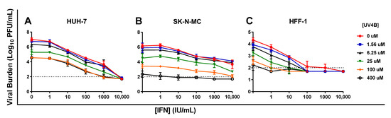 Six concentrations of IFN (0–10,000 IU/mL), and UV-4B (0–400 µM) were evaluated alone and in every possible combination of concentrations against DENV in HUH-7, SK-N-MC, and HFF-1 cells. DENV achieved a peak viral burden of 7 log10 PFU/mL on day 2 in HUH-7 cells. UV-4B and IFN combination regimens augmented antiviral activity relative to monotherapy in this cell line; this effect became particularly apparent when UV-4B concentrations ≥ 25 µM were added to IFN. IFN 100 IU/mL + UV-4B 25 µM reduced viral burden relative to the no treatment control by 3.5 log10 PFU/mL while monotherapy at these concentrations lowered viral titers by 2.5 and 1.7 log10 PFU/mL, respectively (Figure 5A).