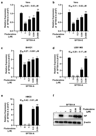 To detect the inhibitory activity of fludarabine on SFTSV, we infected Vero cells with SFTSV-A (JS2010-14) or SFTSV-E (JS2014-16), which are in separate clades evolutionarily, after incubation with fludarabine and detected viral Small (S) gene transcription after 24 h p.i. As shown in Figure 3a,b, fludarabine inhibited SFTVS replication in a concentration-dependent manner with IC50 values of 0.83 ± 0.03 μM for the SFTSV-A strain (Figure 3a) and 0.31 ± 0.02 μM for the SFTSV-E strain (Figure 3b), indicating that fludarabine inhibition of SFTSV was not viral strain dependent. The results in BHK21 cells were similar to those in Vero cells, with an IC50 of 0.27 ± 0.001 μM for the SFTSV-A strain (Figure 3c). We observed that SFTSV replicated well in both U251 MG and HMC3 cells. To analyze whether fludarabine also had a protective effect against SFTSV infection in neuronal cells, we tested the antiviral activity of fludarabine in U251 MG and HMC3 cells. The results showed that fludarabine dose-dependently inhibited SFTSV-A replication in both U251 MG and HMC3 cells with an IC50 of 0.28 ± 0.17 μM in U251 MG cells (Figure 3d) and 0.42 ± 0.01 μM in HMC3 cells (Figure 3e). These results were further confirmed in the infected cells that viral nucleoprotein (NP) expression was obviously inhibited by fludarabine (Figure 3f) in Vero cells, consistent with the qRT-PCR results, indicating that fludarabine could effectively inhibit SFTSV infection in various cell types.