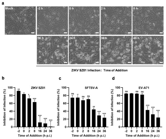 Fludarabine inhibited the viral replication in the first 8 h of viral infection. (a) ZIKV SZ01-induced cytopathic effect (CPE) on Vero cells with fludarabine addition at different time points p.i. Scale bars, 20 μm. (b–d) Time of addition experiment of fludarabine against ZIKV SZ01, SFTSV-A, and EV-A71. Fludarabine diluted to 0.5 μM was added to Vero cells 2 h prior to virus infection or at 0, 2, 8, 16, 24, or 36 h p.i. Virus replication was determined by qRT-PCR assay at 48 h p.i. ZIKV SZ01-induced CPE was observed under a microscope (a). The differences between groups of fludarabine added at 0 h and other time points were evaluated by two-tailed Student’s t test. Data are presented as mean ± SD; *, p < 0.05; **, p < 0.01; ***, p < 0.001; ns, no significance.