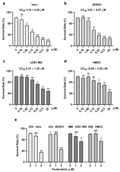 Cytotoxicity of fludarabine. (a–e) Cytotoxicity of fludarabine in Vero, BHK21, U251 MG, and HMC3 cells. Cells were incubated with the indicated concentrations of fludarabine for 48 h, followed by measuring cell viability using CCK8 assay. The differences between groups without and with fludarabine at different concentrations were evaluated by two-tailed Student’s t test. Data are presented as mean ± SD; *, p < 0.05; **, p < 0.01; ***, p < 0.001; ns, no significance.