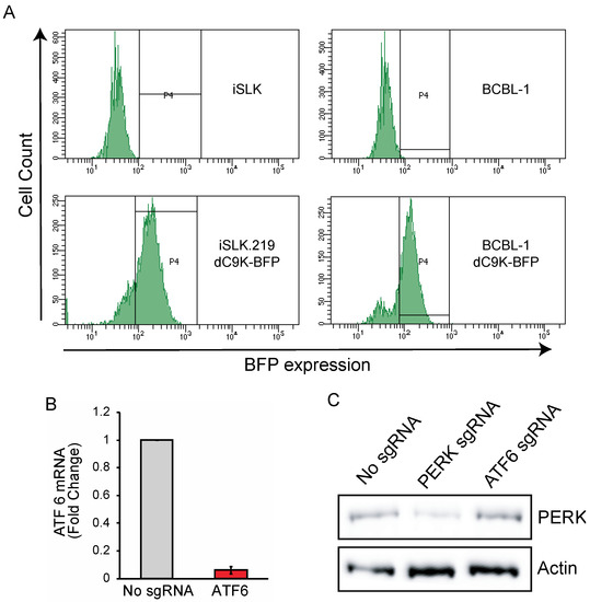 To test whether the CRISPRi system was functional in the cell lines mentioned above, we transduced them with sgRNAs targeting the promoters of the endogenous genes PERK and ATF6, which encode ubiquitously expressed endoplasmic reticulum stress sensor proteins (Table S1) [39]. The lentiviral vector encoding the sgRNAs also encodes BFP and a puromycin selection marker, allowing the pharmacological and FACS-based selection of positive transductants. We selected BCBL-1-dC9K cells expressing the ATF6 targeting sgRNAs by treating them with puromycin. Next, we measured the expression levels of ATF6 by RT-qPCR and observed robust repression (>90%) of the corresponding mRNA in cells expressing the targeting sgRNA (Figure 1B). As the KSHV.219 recombinant virus present in iSLK-219-dC9K has a puromycin resistance marker, we selected BFP+ cells expressing the PERK targeting sgRNA by FACS. The expression of BFP is more efficient from the sgRNA vector than from the dCas9-KRAB vector, thus allowing for the selection of sgRNA transduced cells based on BFP+ status. We evaluated the efficiency of PERK silencing by CRISPRi in the iSLK-219-dC9K cell by immunoblot and observed a substantial reduction in PERK protein levels (Figure 1C). Together, these results show that, expectedly, CRISPRi efficiently silences host gene promoters in KSHV-infected iSLK.219 and BCBL-1 cells (Figure 1B,C).