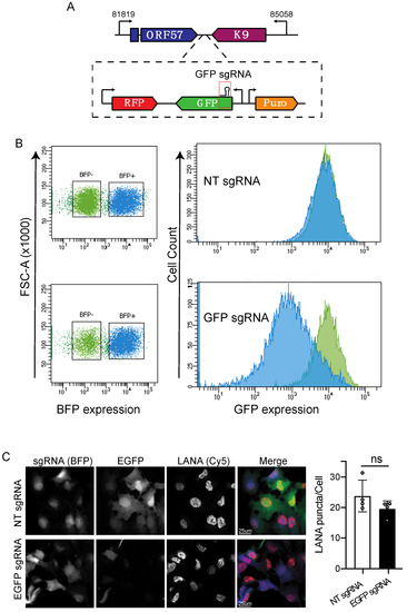 CRISPRi silencing of KSHV-encoded EGFP. (A) Region of the viral genome encoding EGFP and position of the sgRNA. (B) Flow cytometry analysis (MFI) of iSLK-219-dC9K cells transduced with sgRNAs targeting EGFP or non-targeting (NT) sgRNAs. Note the downregulation of EGFP expression in cells transduced with the targeting sgRNA. (C) Immunofluorescence and confocal microscopy analyses of paraformaldehyde-fixed, BFP expressing cells (sgRNA), EGFP and LANA in iSLK-219-dC9K cells transduced with sgRNAs targeting EGFP or non-targeting (NT) sgRNAs. Quantification of LANA puncta/Cell in four independent fields (t-Test, ns p = 0.15).