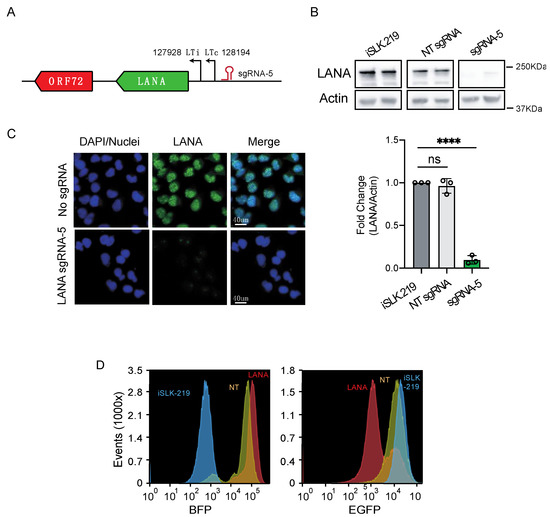 The viral cycle is divided into two main phases: latency, a persistent and dormant state with low viral gene expression, and the lytic cycle, a transcriptionally and translationally active state and the productive stage of infection. Having determined that CRISPRi can effectively repress viral-encoded genes (EGFP, Figure 2B), we next examined whether CRISPRi is equally effective at silencing latent and lytic genes. First, we explored CRISPRi silencing of a KSHV latent gene. To this end, we chose to silence LANA, a key mediator of latent viral replication that tethers the viral episome to host chromosomes by bridging the interaction between the KSHV genome and host chromatin [40,41,42]. To test whether CRISPRi repressed LANA, we transduced iSLK-219-dC9K cells with sgRNAs targeting the LTc promoter (Table S2, Figure 3A), which is known to be preferentially used for LANA transcription in these cells [6]. Two weeks after transduction, we selected the upper quartile of BFP+/sgRNA+ expressing cells by FACS and evaluated LANA levels in this population. We observed a substantial reduction in LANA expression by immunofluorescence and immunoblot analyses (~90% expression loss, p < 0.0001) (Figure 3B,C) and a concomitant reduction in the expression of the virus-encoded EGFP reporter by flow cytometry in cells transduced with LANA-targeting sgRNAs (Figure 3D). These results indicate that CRISPRi loss-of-function of LANA results in the loss of viral episomes and agree with recent observations showing that CRISPR-Cas9-mediated mutagenesis of LANA results in episome loss and latency disruption [18]. Together, these results indicate that CRISPRi can mediate the efficient knockdown of KSHV latent genes.