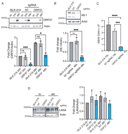 CRISPRi silencing of immediate–early genes in iSLK-219 cells. Immunoblot analysis of (A) ORF57 (one-way ANOVA, 24 h **** p < 0.001, 48 h * p value 0.025), (B) K8.1 (one-way ANOVA, 48 h *** p < 0.001) and (D) LANA (Kruskal–Wallis test, 0.99 < p < 0.3) in latent and lytic (24 and 48 h post-reactivation) iSLK-219 cells, and iSLK-219-dC9K cells transduced with a non-targeting (NT) sgRNA or an ORF57-specific sgRNA. Image representative of three biological replicates. Bars: quantification of the data. Error bars: standard deviation, ns, not significant. (C) Quantification of viral titers (IU, infectious units) in the filtered supernatant of iSLK-219 or iSLK-219-dC9K cells transduced with a non-targeting (NT) sgRNA or an ORF57-specific sgRNA, collected at 72 h post-reactivation. Error bars: standard deviation. (one-way ANOVA, **** p < 0.001, *** p < 0.001).