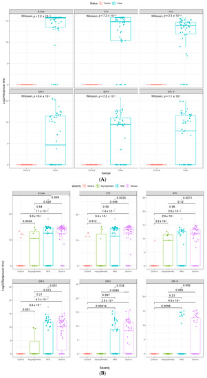 Sensitivity, specificity, and confidence intervals estimate were estimated using previously reported methodologies [21]. Other statistical analyses and graphical representation were generated using the R programming language (v 4.0.2) and GraphPad Prism (v 9.0; GraphPad Software, San Diego, CA, USA). Pearson’s correlation was performed to establish correlations between cumulative titer and various variables. Either the Wilcoxon–Mann–Whitney test or a one-way ANOVA with Welches correction was applied to determine the statistical significance of the differences observed between multiple independent groups (HC, mild and severe or case vs. control).