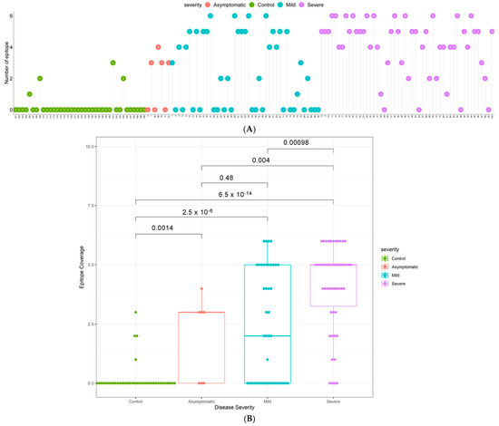 Epitope coverage in multi-ethnic Cohort 3. (A) Epitope coverage for each sample for controls, mild cases, and severe cases (n = 138). Numbers in dots represent the EPC score per participant. (B) Box plots displaying the epitope coverage for each disease class. p-values were determined using the Wilcoxon test (unpaired, two-tailed).